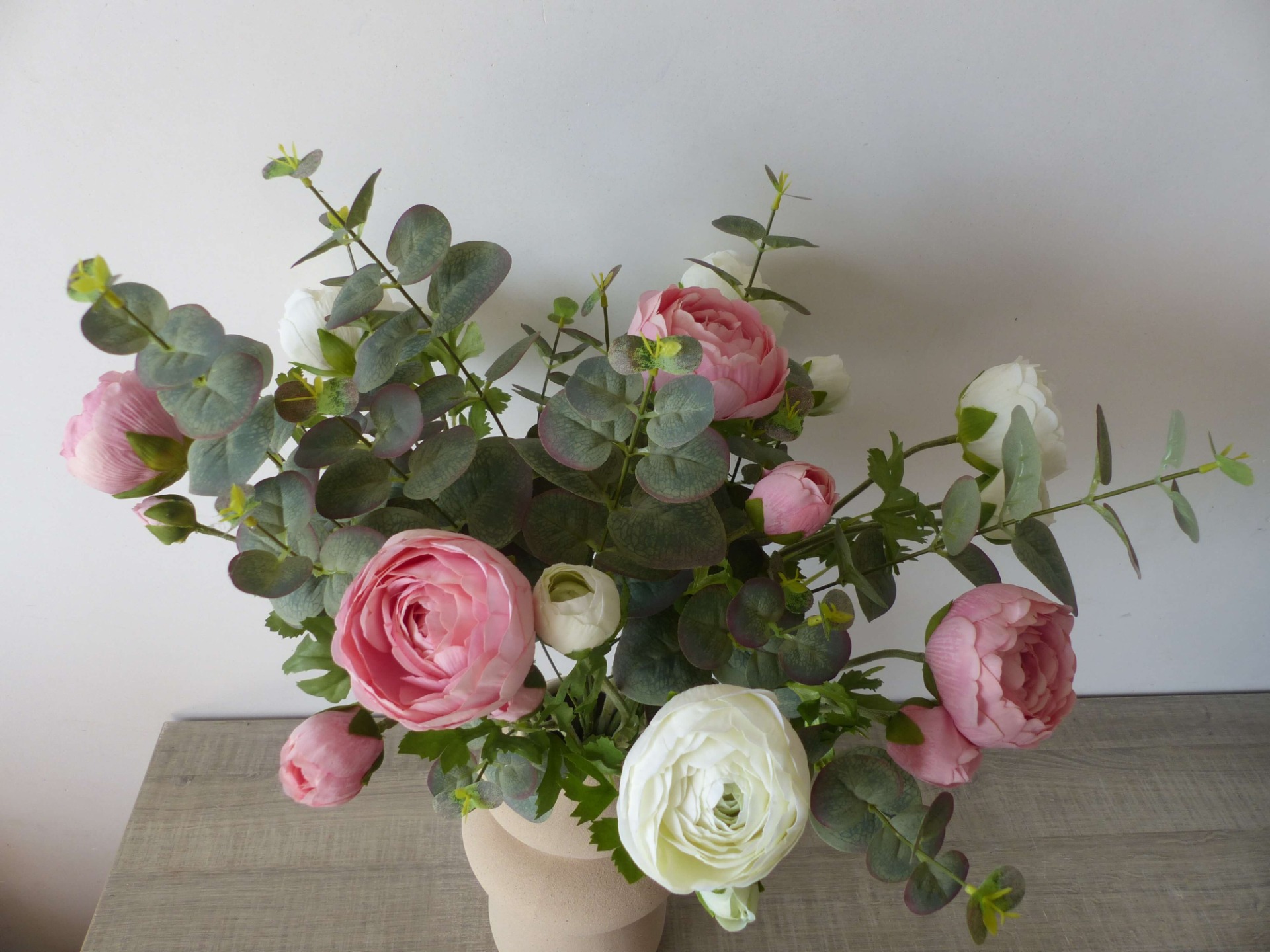 3x eucalyptus4x witte ranonkel4x roze ranonkel