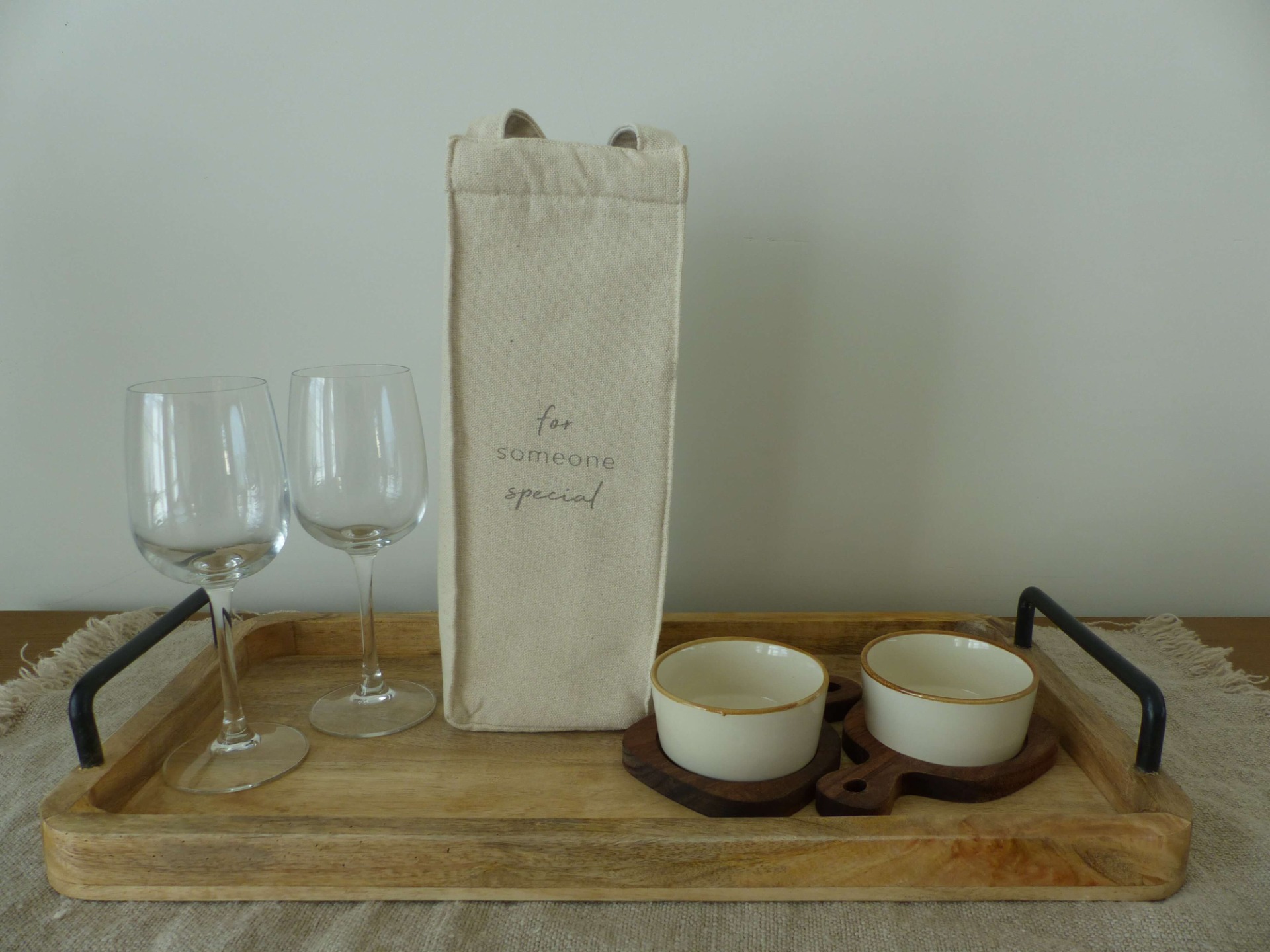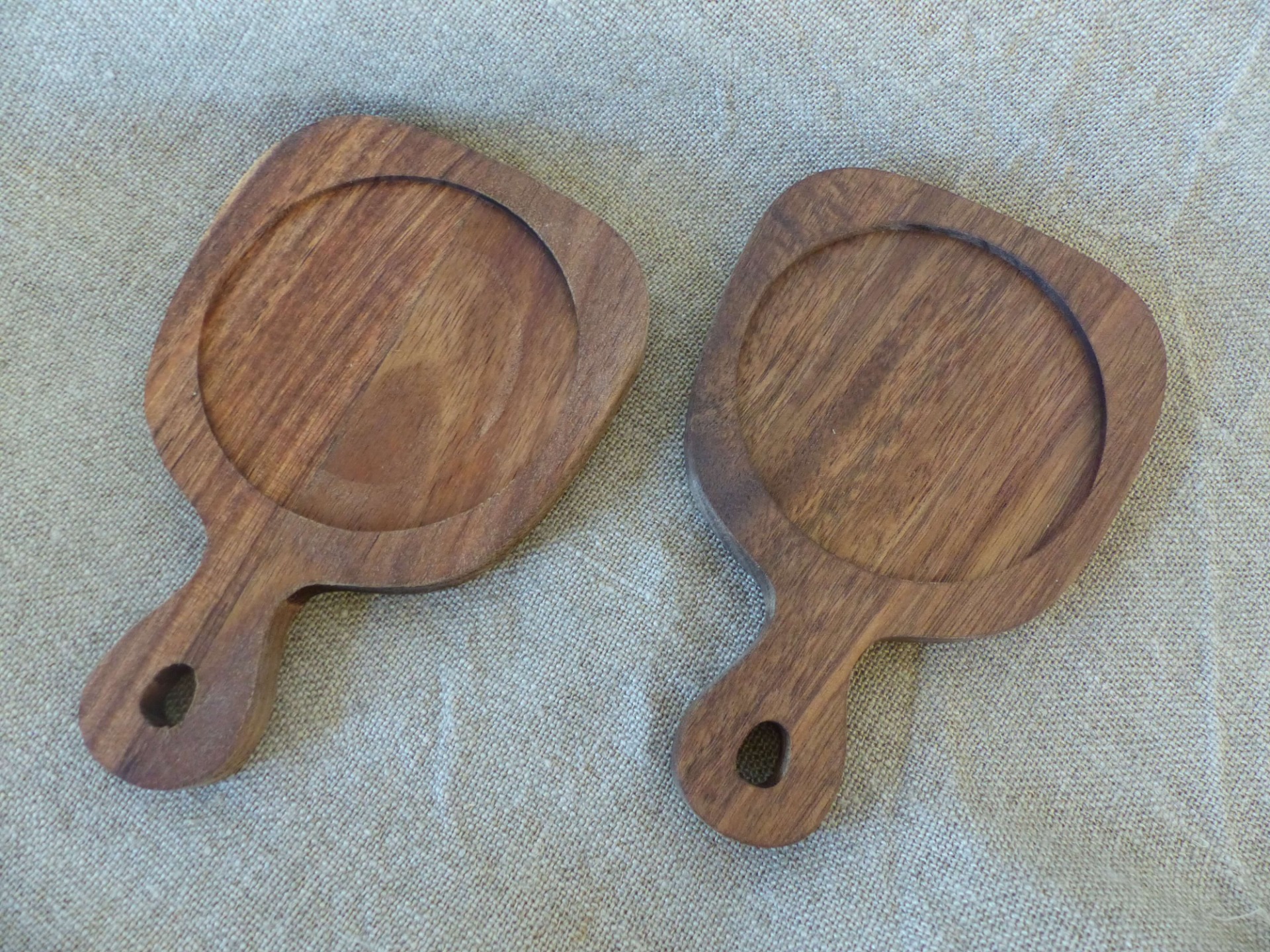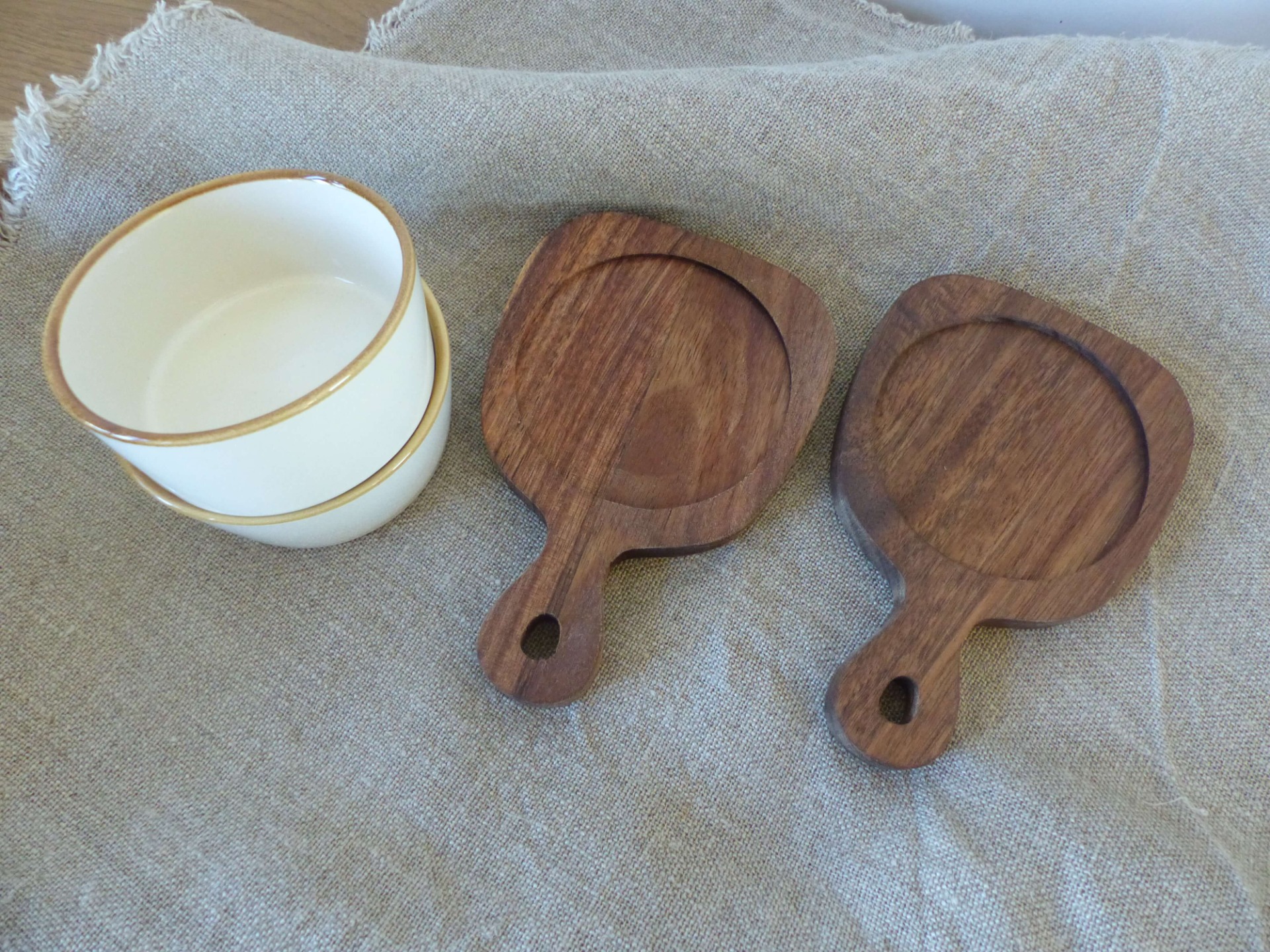 Deze serveerschaaltjes zijn ideaal bij het serveren van lekkere snacks en dips. Deze duo set bestaat uit twee acaciahouten plankjes met een handig handvat en twee keramieken schaaltjes. Door de inkepingen in het plankje blijven de schaaltjes goed op hun plaats. De houten plankjes zijn niet vaatwasbestendig.