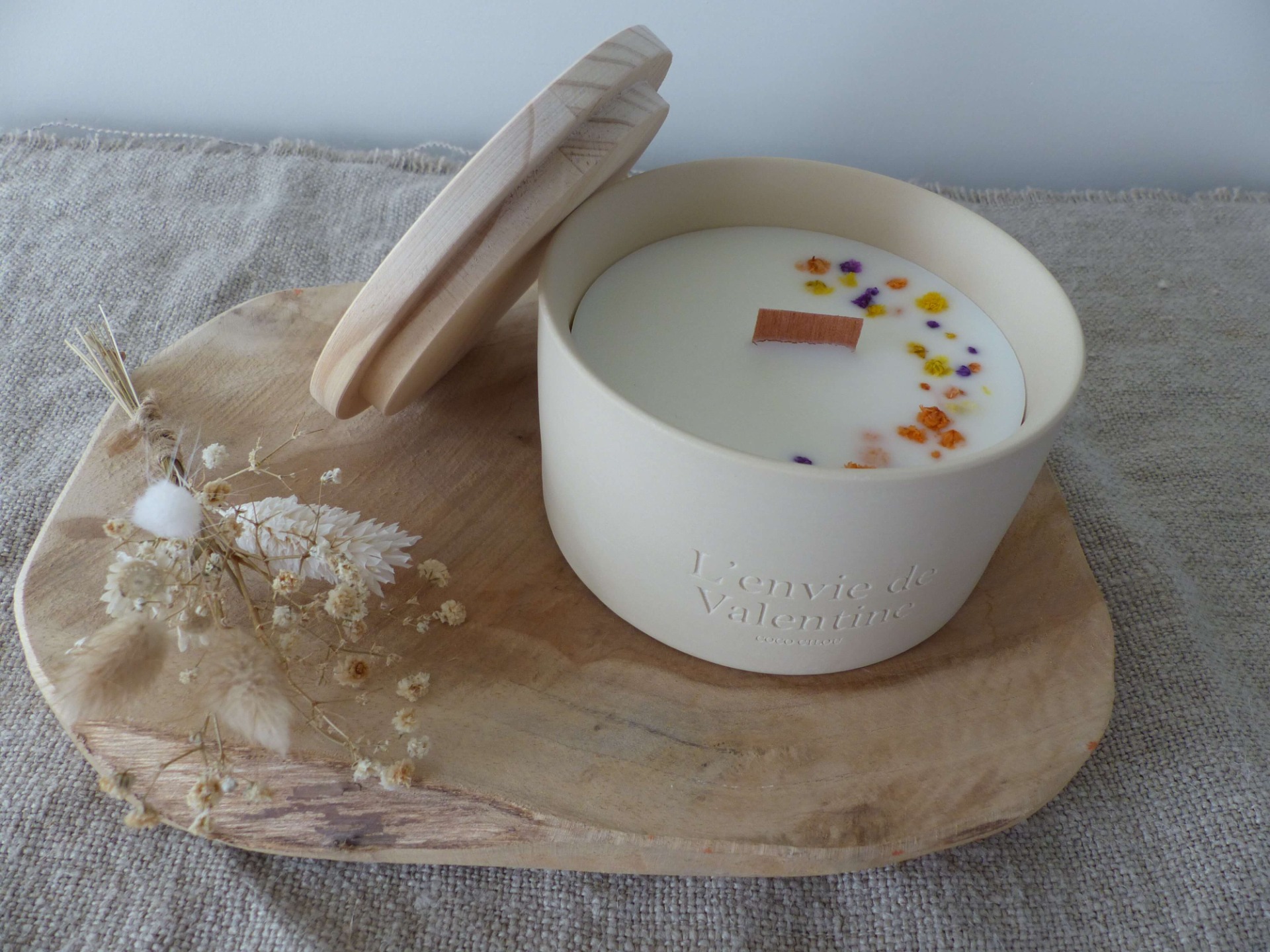De kaars bevat 100% natuurlijke sojawas en een houten wiek. Sojawas is plantaardig, biologisch afbreekbaar en produceert nauwelijks roet, wat zorgt voor een schonere verbranding binnenshuis. De geur verspreidt zich geleidelijk en subtiel, waardoor een aangename, rustige sfeer ontstaat. De keramische pot is nadien herbruikbaar.