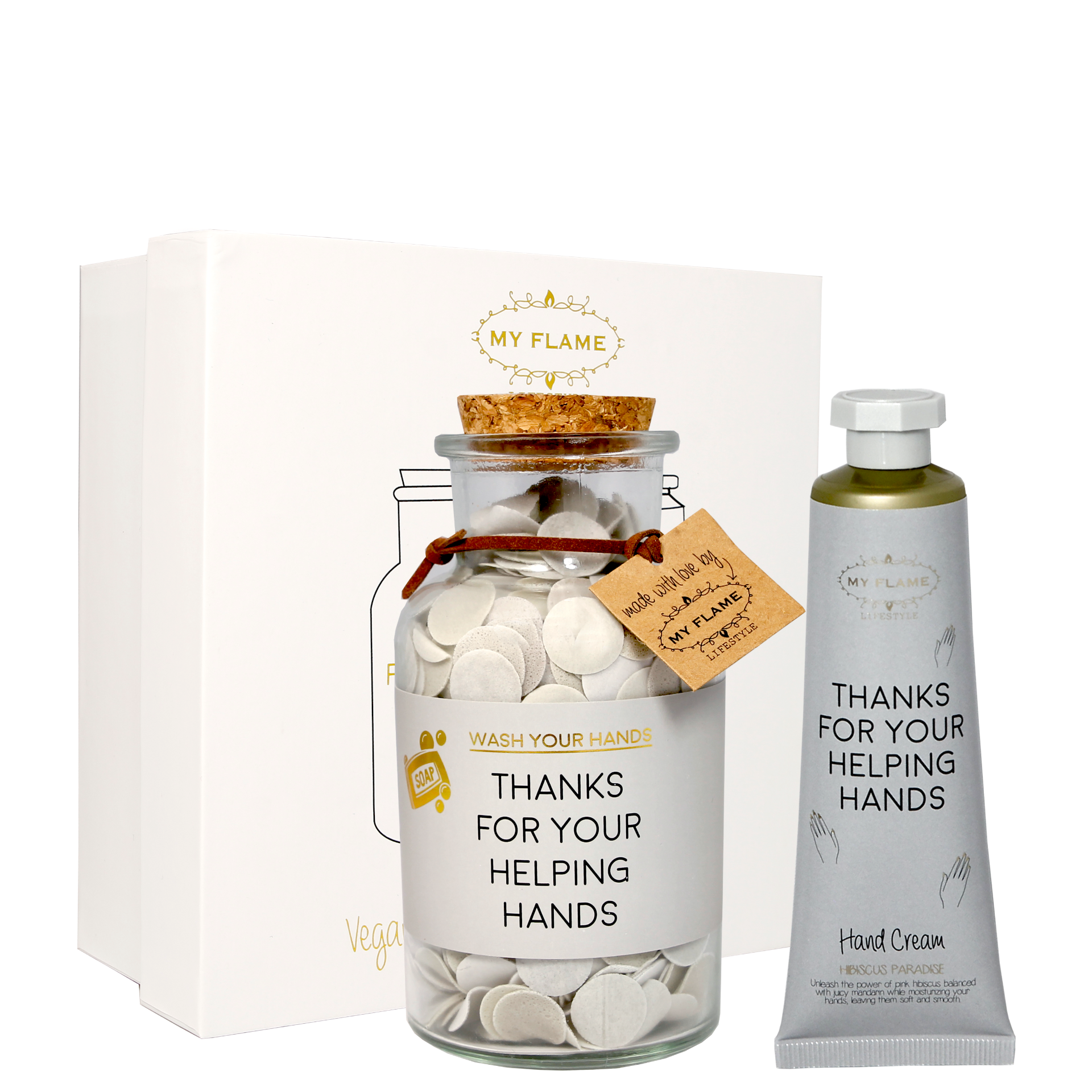 Een luxe cadeaubox met daarin een heerlijke handcrème en een potje confetti handzeep.