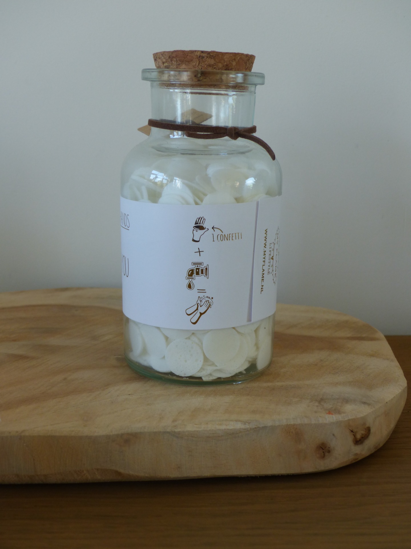 Handzeep in de vorm van confetti. De confetti zal gaan schuimen in contact met water en oplossen zoals normale zeep.