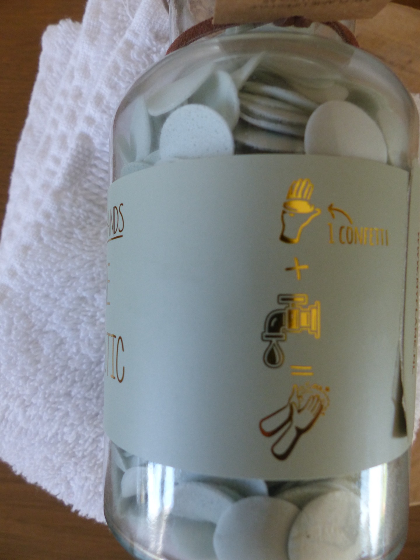 Handzeep in de vorm van confetti. De confetti zal gaan schuimen in contact met water en oplossen zoals normale zeep.