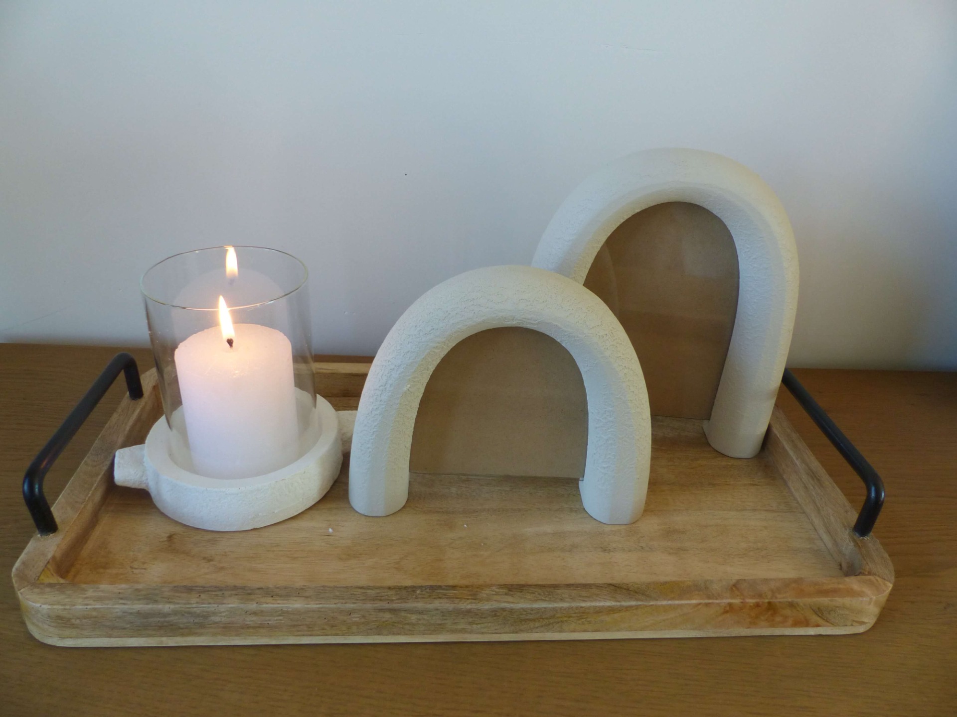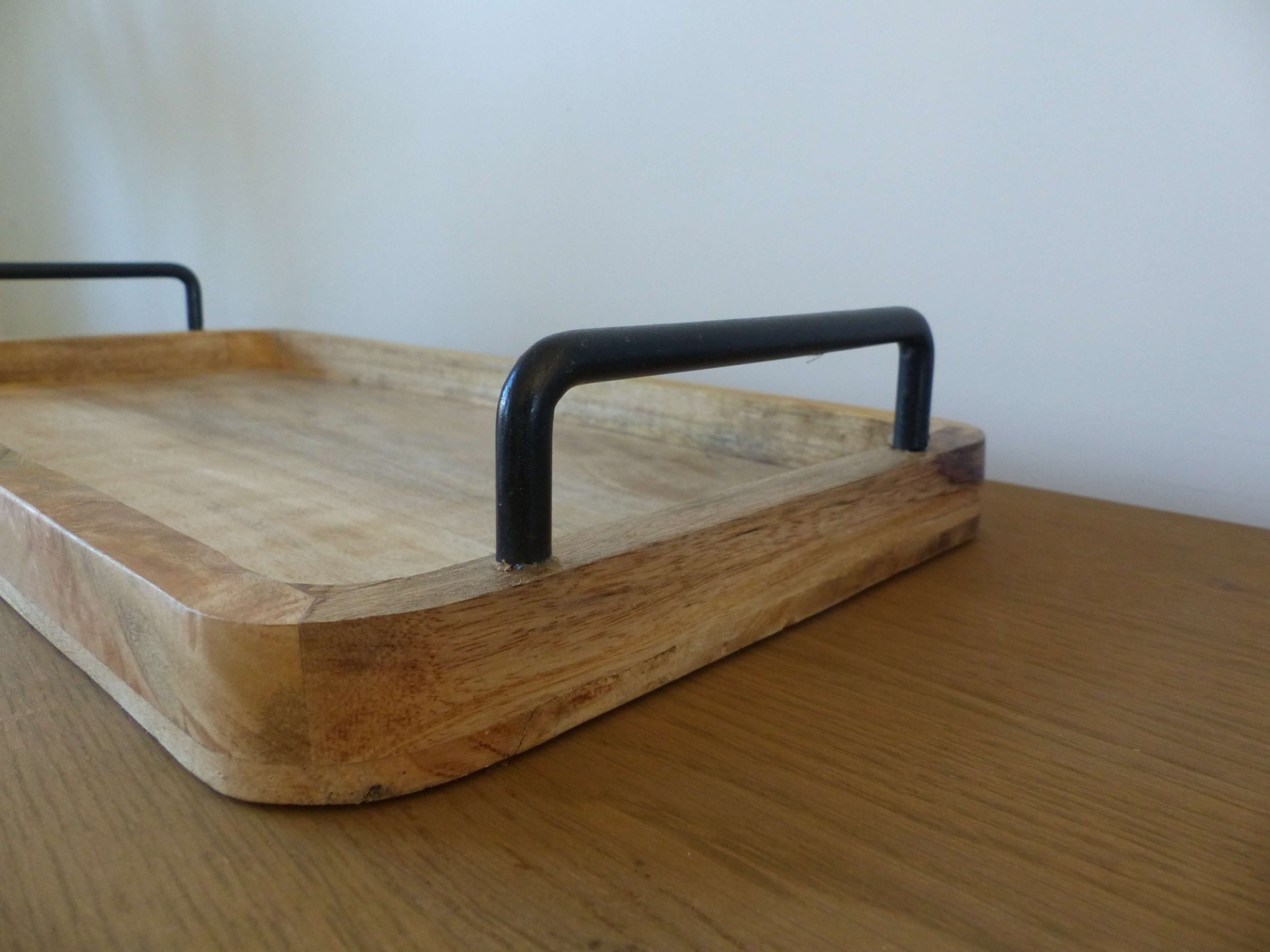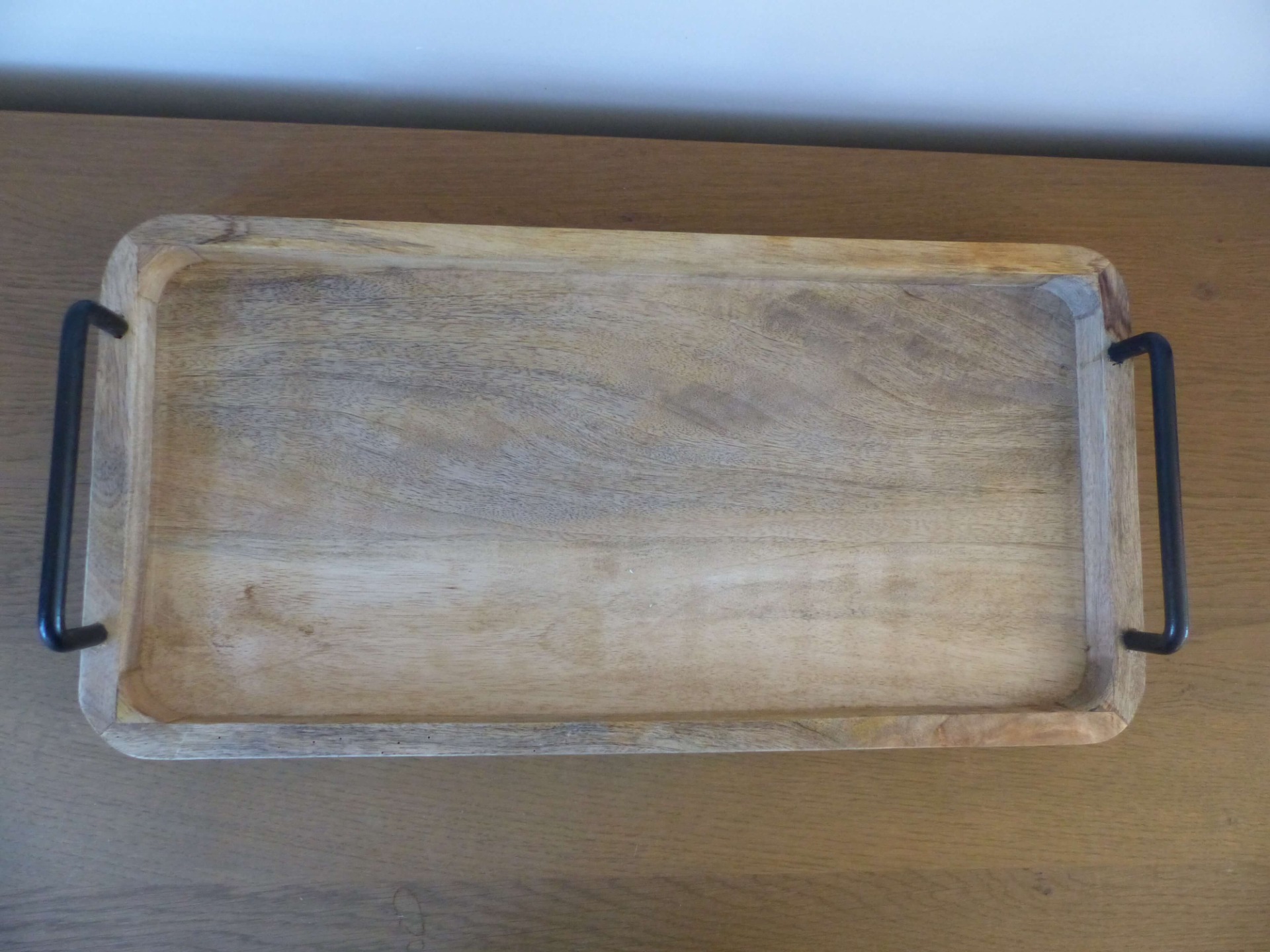 Dit houten dienblad met zwarte ijzeren handvaten is de perfecte basis voor stijlvolle decoraties in het interieur. Het hout en de zwarte accenten vormen een prachtige combinatie. Met dit dienblad creëer je de mooiste creaties met kaarsen, vazen of andere accessoires. Ook bij een gezellige hapjesavond mag dit dienblad niet ontbreken.
