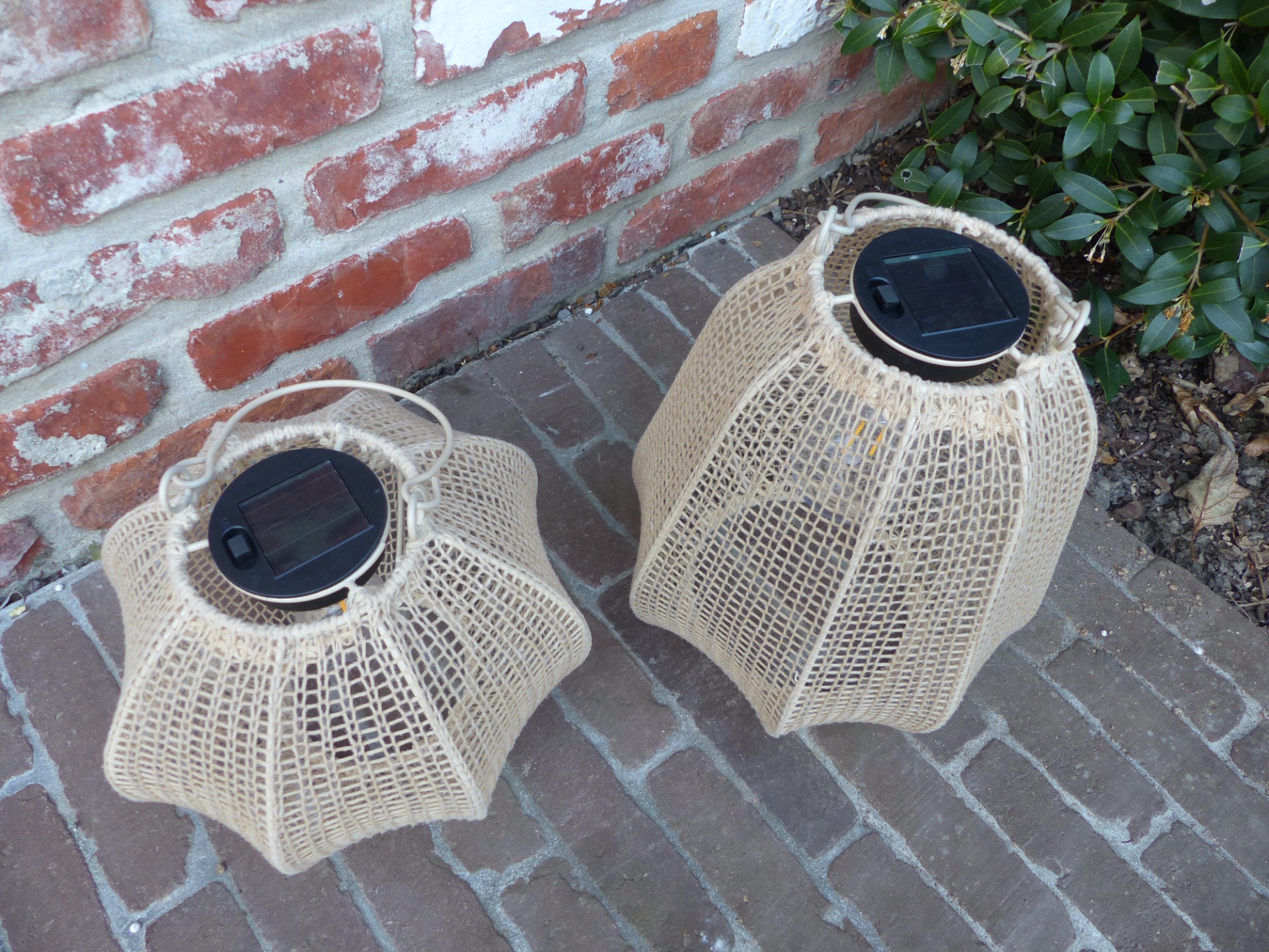 Deze leuke solar lantaarns brengen een warme en gezellige sfeer in je tuin of op het terras. Kan je neerzetten of ophangen. Overdag laden de solar lampen op in het zonlicht (zorg dat de schakelaar op 'on' staat) en zodra de avond valt, verspreiden ze een zacht, warm licht. Perfect voor gezellige avonden. Dit product is gemaakt van natuurlijk materiaal en wordt bij vochtig weer best binnen geplaatst.