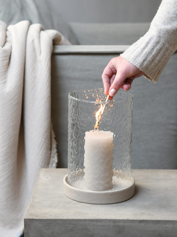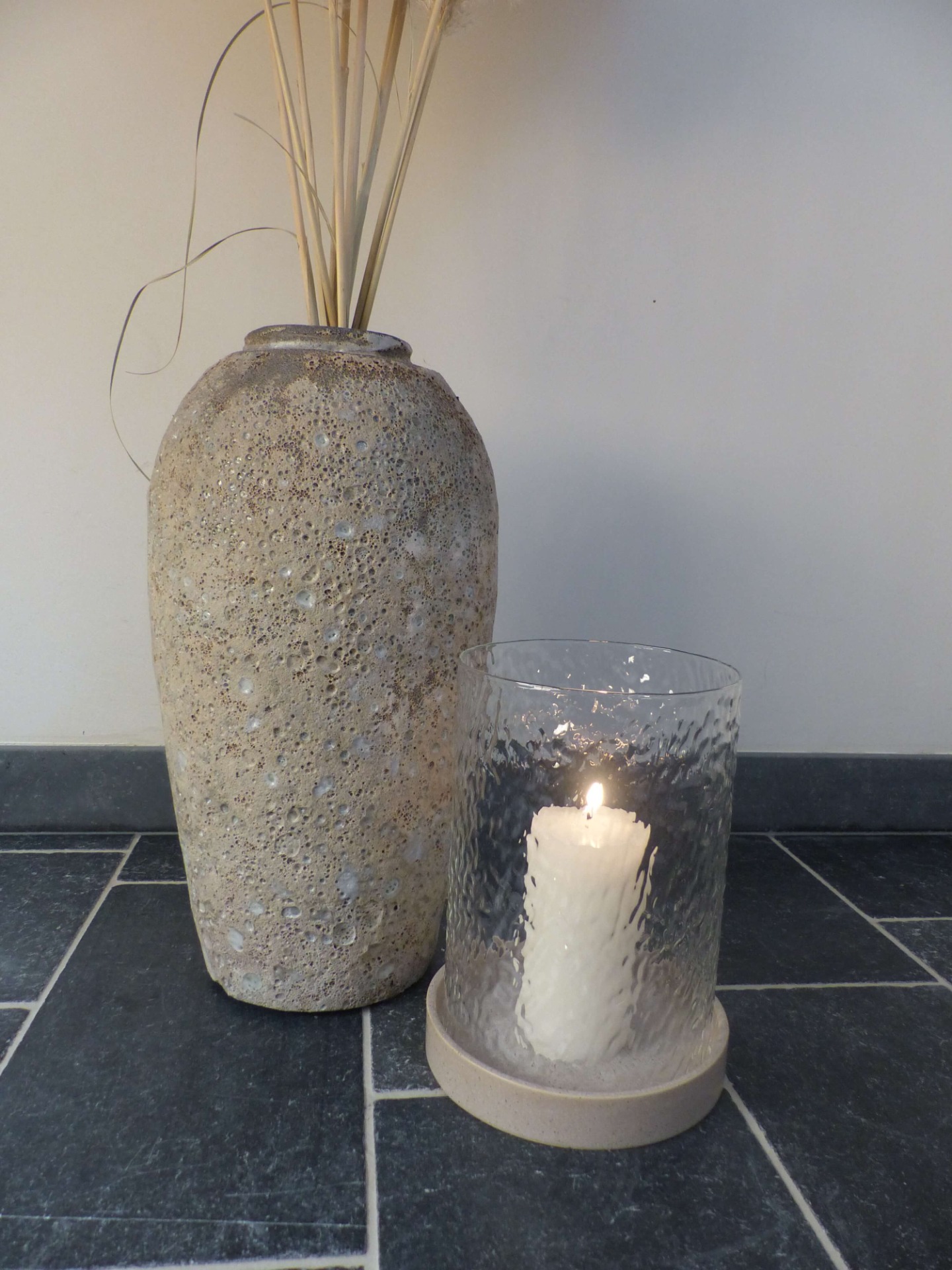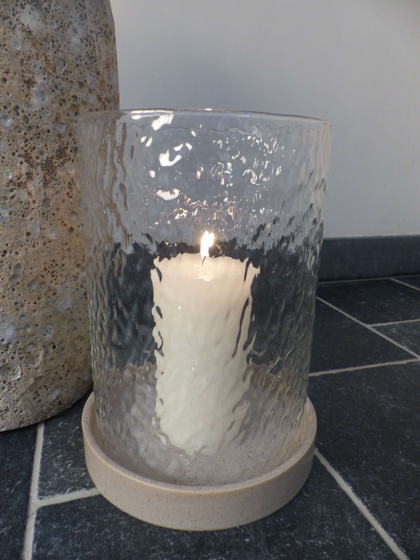 Creëer een warme sfeer met deze prachtige lantaarn. Het gehamerde glas is mond geblazen en weerkaatst de warme gloed van de kaars. Het glas sluit perfect aan op de keramische voet.